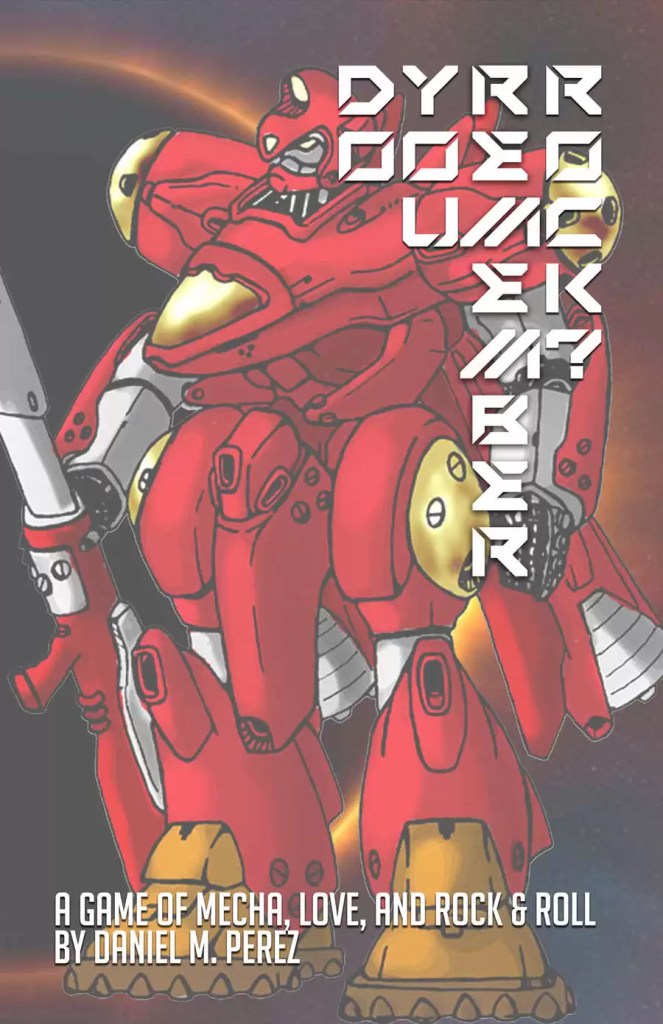 DO YOU REMEMBER ROCK? is a roleplaying game for a DJ (game master) and one to three players inspired by the popular anime of transformable fighters, love triangles, and rock music. Players take the role of an iconic character, and play to resolve their emotional issues with the use of a music Playlist to drive conflict resolution. Jump in your mecha, grab your microphone, and bare your feelings to an awesome soundtrack.
